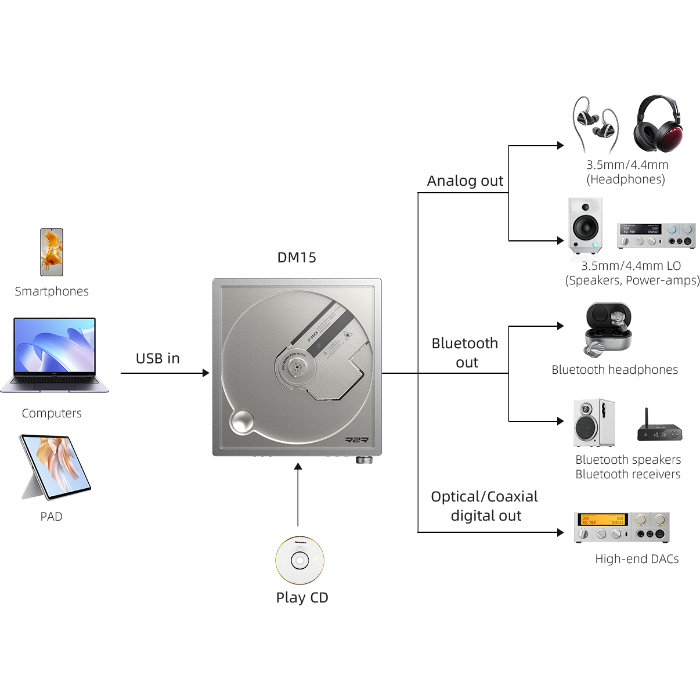 DM15 R2Rは、ポータブルCDプレーヤー、HiFiグレードのUSB DAC、USB/CDソースの高解像度Bluetooth送信、USB/CDデジタルトランスポート機能をすべて一つのユニットに統合しており、同等のポータブルCDプレーヤーよりもはるかに優れた汎用性と互換性を提供します。
