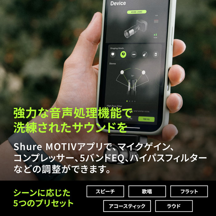 このマイクは箱から取り出して接続するだけでも十分に性能を発揮します。さらに音質を微調整して洗練させたいときのために、マイクゲイン、ハイパスフィルター、リミッター、コンプレッサー、5 バンドEQ などの幅広い内蔵オーディオ処理機能が搭載されており、録音シーンに応じた5 つのプリセットも用意されています。