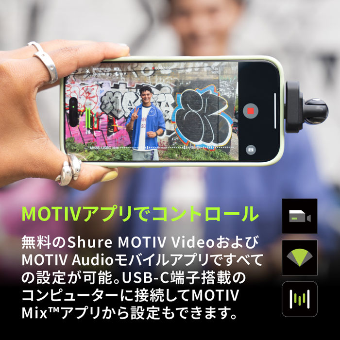 無料のShure MOTIV Video およびMOTIV Audio モバイルアプリは、MV88 のすべての設定を行うための鍵となります。