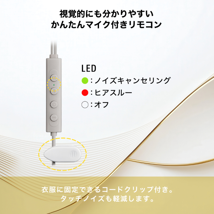 コードのぶらつきや絡まりを防ぎ、衣服に挟んで装着できるため、タッチノイズも軽減します。