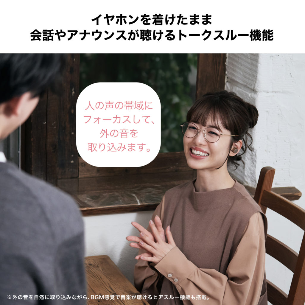 イヤホンを着けたまま、会話やアナウンスが聴けるトークスルー機能