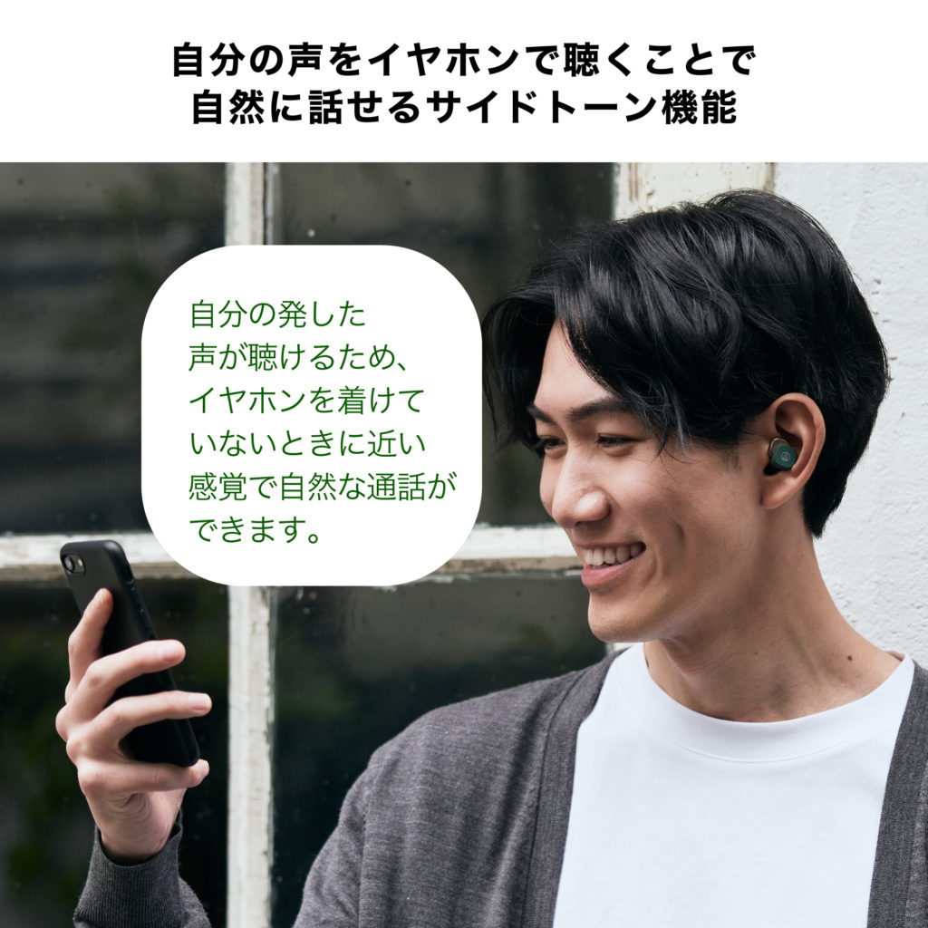 イヤホンを装着したときに聴こえにくくなる自分の声。サイドトーン機能により、通話の際に本製品のマイクを通して自分の発した声が聴けるため、閉塞感が緩和され、イヤホンを着けていないときに近い感覚で自然な通話ができます。通話中にありがちな、必要以上に大きな声を出すこともありません。