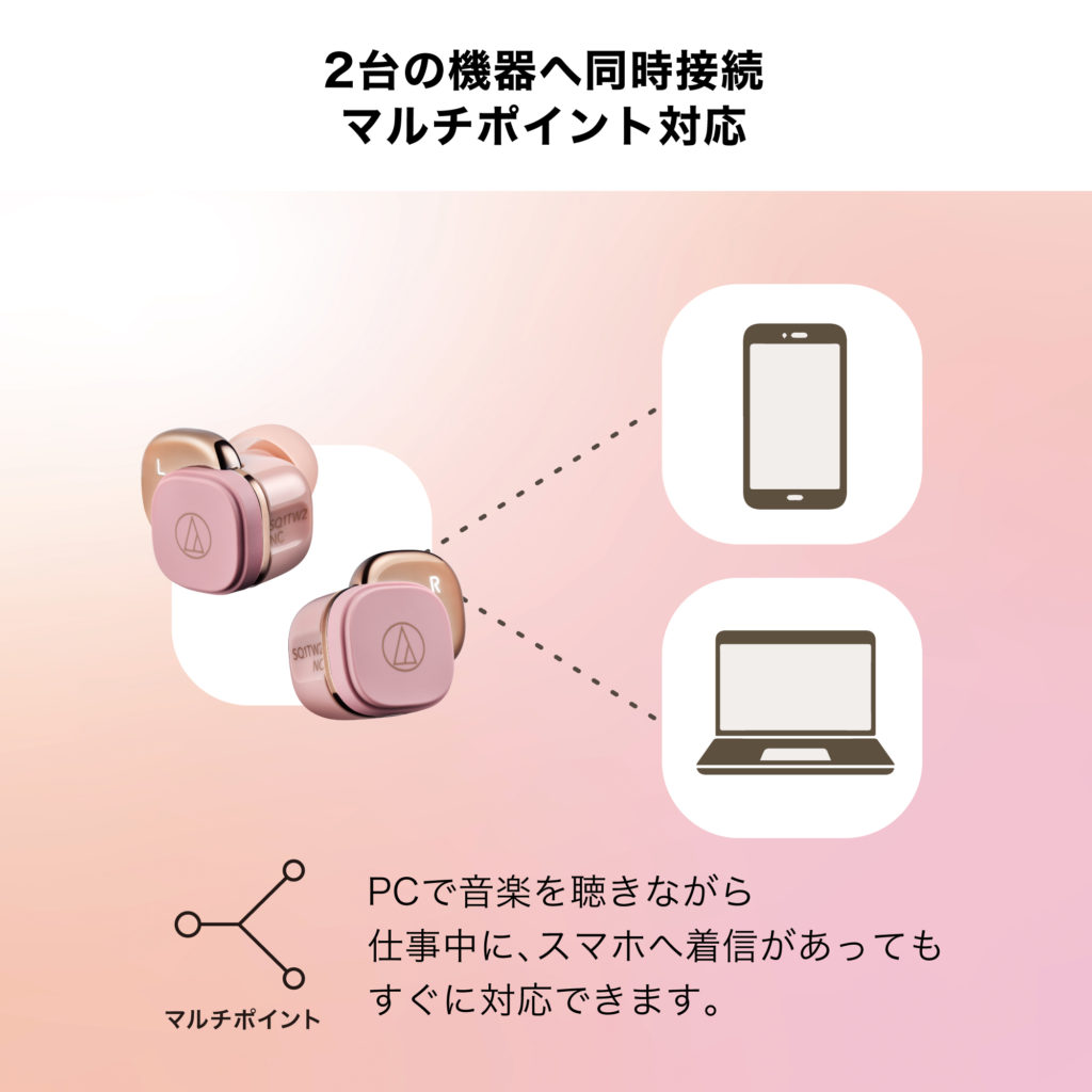 毎日使うスマートフォンと、仕事で使うPC・タブレットなどから2台を選び、同時にBluetooth接続できます。例えば、PCで音楽を聴きながら仕事をしている際、スマートフォンへ着信があってもペアリングし直す手間がなく、即座に対応できます。