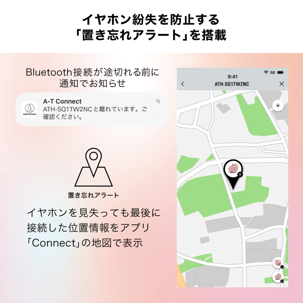 Bluetooth®接続の電波が弱くなっていることを知らせる「置き忘れアラート」をONにすると、接続が途切れる前にイヤホンから離れていることに気付くことができます。