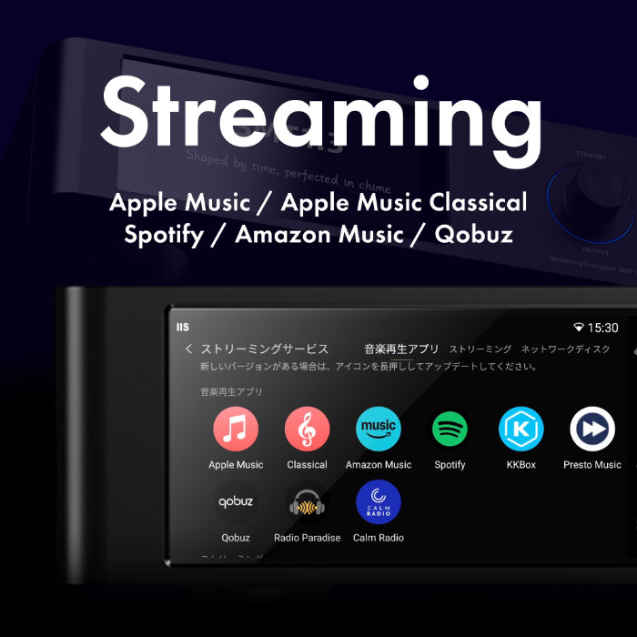 SMT1.3はApple Music、Apple Music Classical、Spotify、Amazon Music、Qobuzなどの『主要ストリーミングサービス』に対応しています。