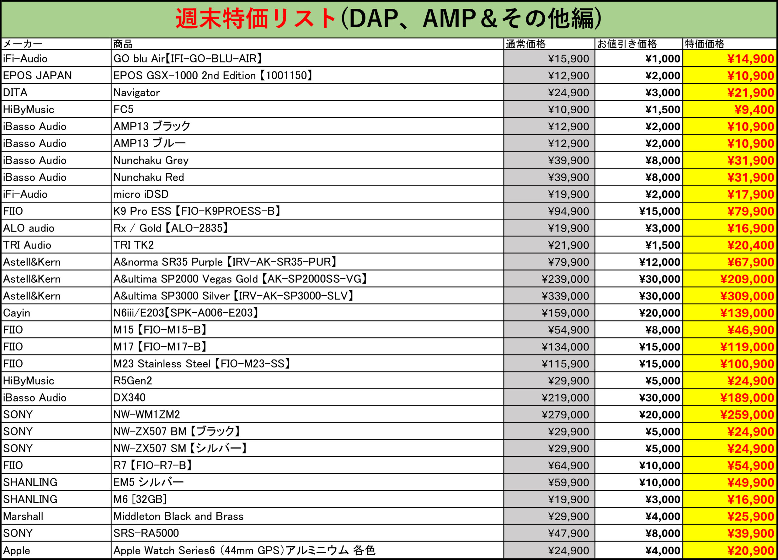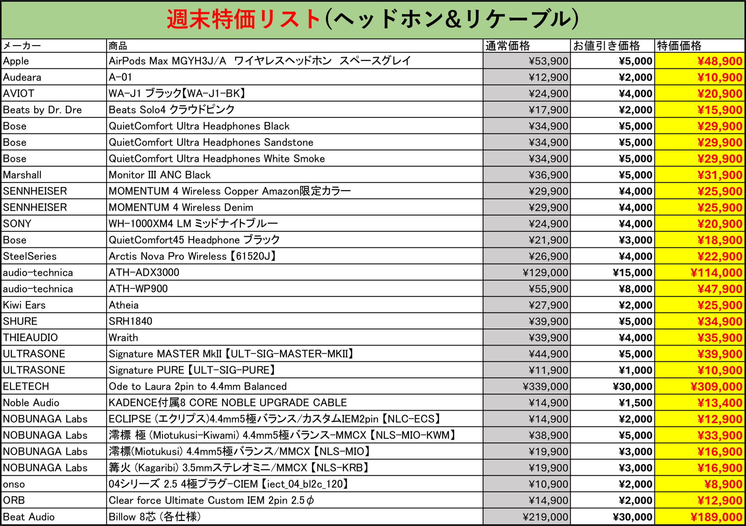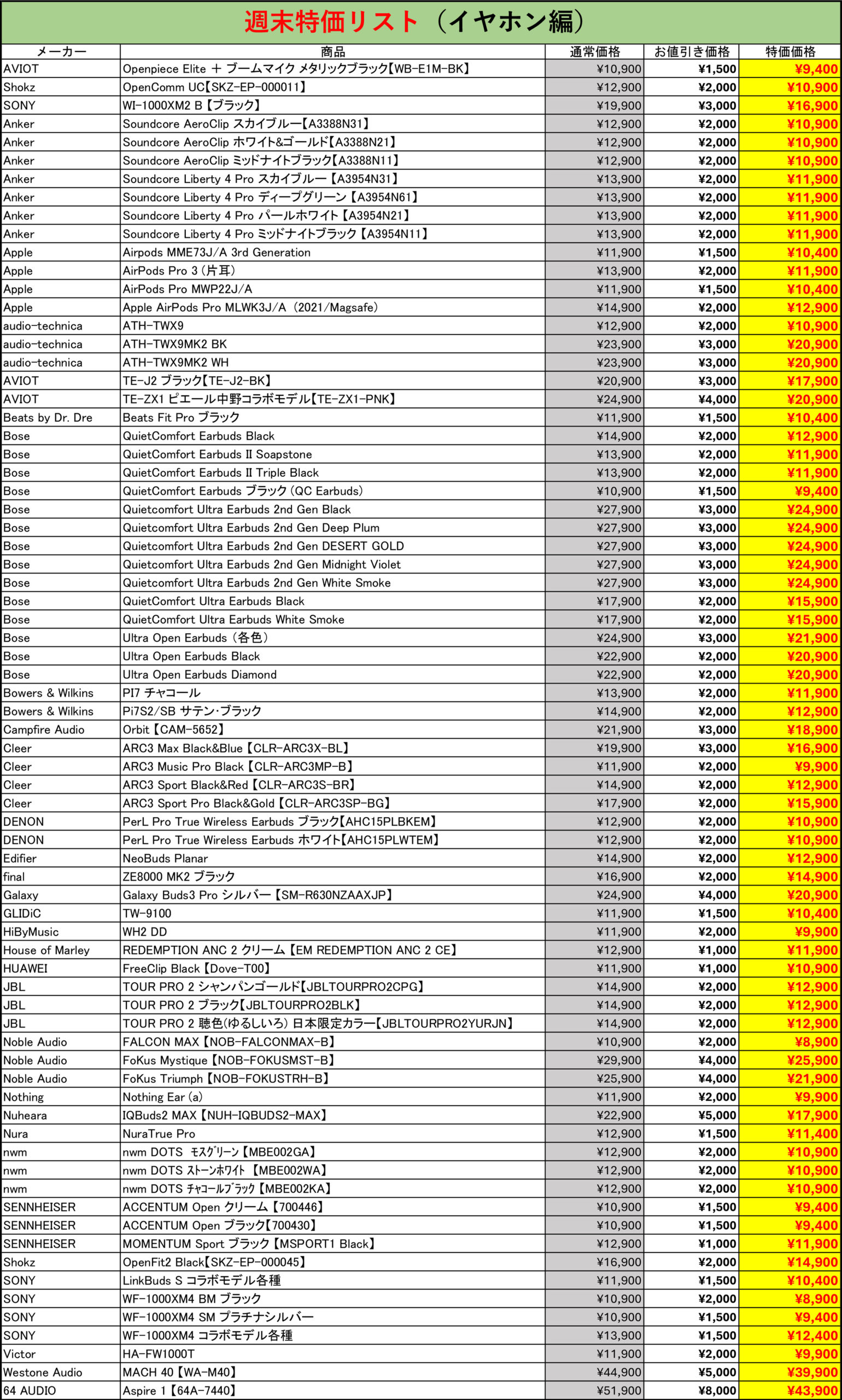 週末特価対象製品一覧
