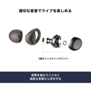 ライブを全力で楽しむためのイヤーケア ライブサウンドに最適化されたフィルタリング構造 オーディオテクニカの音響設計ノウハウを活かし、ライブやフェスなどの大音量環境に対応したイヤープラグです。 2層のフィルタリングダンパーと、音楽リスニング用イヤピースにより、音質を保ちながら、適切な音量でライブサウンドを楽しめます。