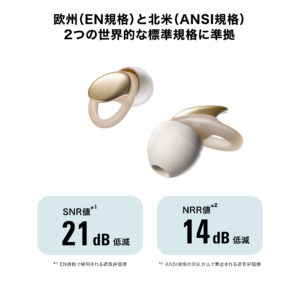 世界的な標準規格に準拠した聴覚保護具 各国の規格に準拠した安心設計 第三者機関によって、欧州(EN)と北米(ANSI)、2つの標準規格でテスト・検証され、認定されたイヤープラグ。 聴覚保護具として安心してご使用いただけます。