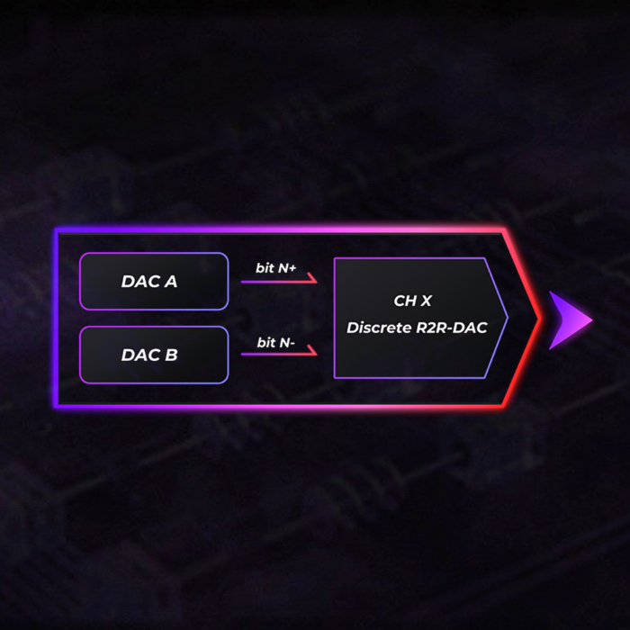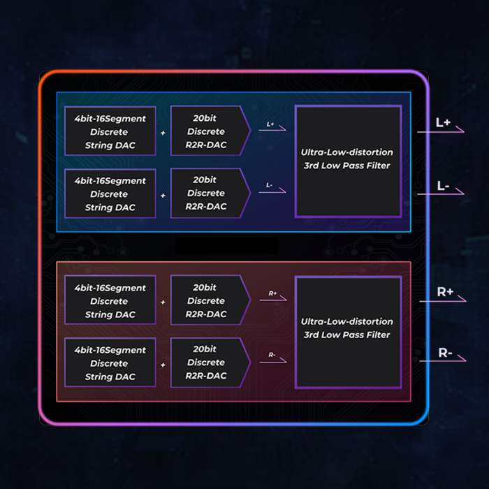 DX270は20bit R2R+4bitストリングDACのハイブリッドD/Aアーキテクチャを採用し、従来の24bit R2Rとは異なり、MSB(最上位ビット)とLSB(最下位ビット)に分割してD/A処理を実行します。重要な上位ビットの処理には、4bitストリングDACを搭載し、直列抵抗とセレクタースイッチにより目標電圧に段階的に高精度で近似させる方式を採用しています。デジタル信号の中でも重要な値となる、ビット群を高精度に制御することで、広いダイナミックレンジと低グリッチ・エネルギー、そして優れたTHD+N性能の利点を叶えています。
