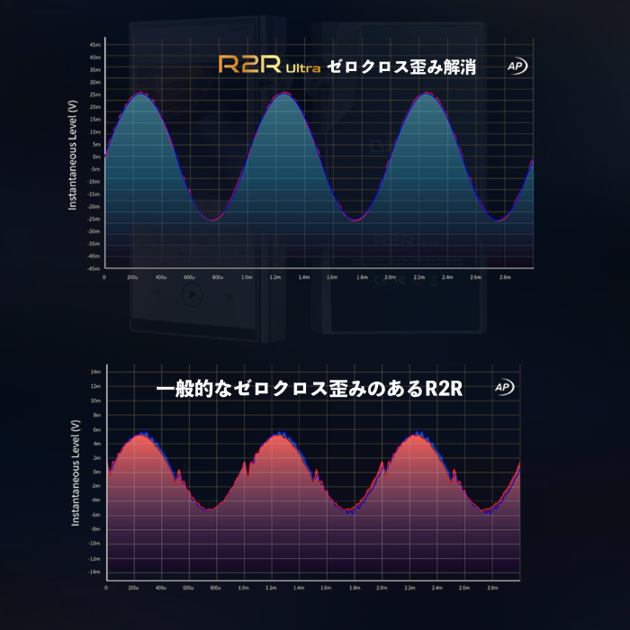 DACのゼロクロス歪みとは、DACが信号をゼロ電圧付近で処理する際に発生する、非線形歪みのことです。この非線形歪みは従来のR2R DACでは解消できていない問題であり、顕著に音声信号のディテールが失われたり、ボトムノイズの異常や低音域の濁りなどを生み出すことがあります。DX270は、完全差動アーキテクチャと精密なキャリブレーションにより、-120dBという極めて微小な信号レベルでもこの歪みをゼロに抑え、楽器の倍音やボーカルの息遣いなどの、楽曲に含まれる空気感やステレオイメージまで鮮明に表現することができます。