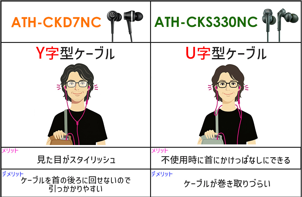 また、ATH-CKD7NCは操作しやすいY字型ケーブル、ATH-CKS330NCは不使用時に首へ掛けられるU字型ケーブルを採用しており、装着スタイルに違いがあります。