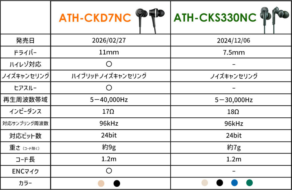 上位モデルのATH-CKD7NCは、φ11mmの大型ドライバーと2つのマイクを用いたハイブリッド方式により、ハイレゾ級の音質と高い消音性能を実現しています。一方、ATH-CKS330NCはφ7.5mmドライバーによる重低音重視の設計で、マイク1つの標準的なノイキャンを搭載。