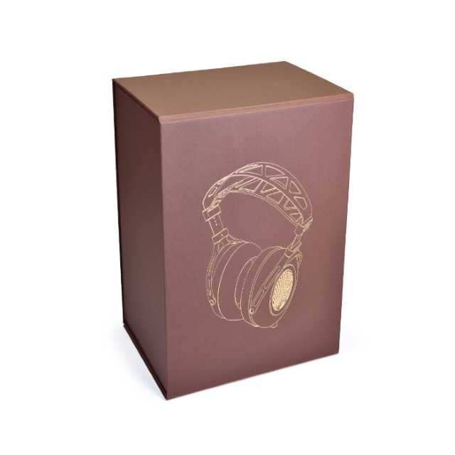 落ち着いたブラウンカラーを基調とした外装には、ヘッドホンのシルエットをゴールドラインであしらい、製品の存在感と高級感を演出しています。