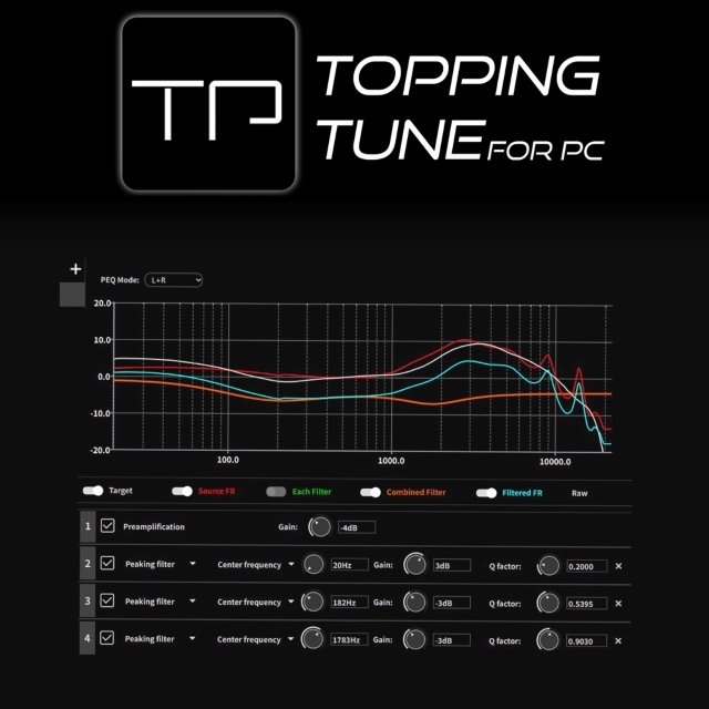 バンドの周波数帯域調整に対応し、TOPPINGが独自開発したアジャストメントアルゴリズムとデスクトップソフトウェアにより、周波数・Gain・帯域幅を細かく設定することができる「TOPPINGオリジナルのPEQ」です。