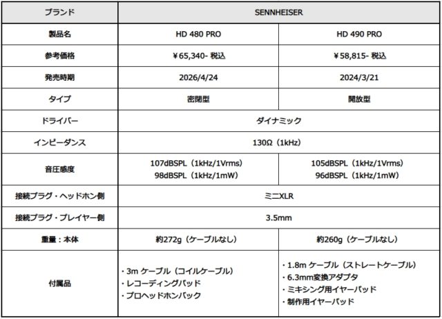 それでは、HD 480 PROとHD 490 PROを比較していきましょう。スペックを見てもかなり似ているヘッドホンかと思います。